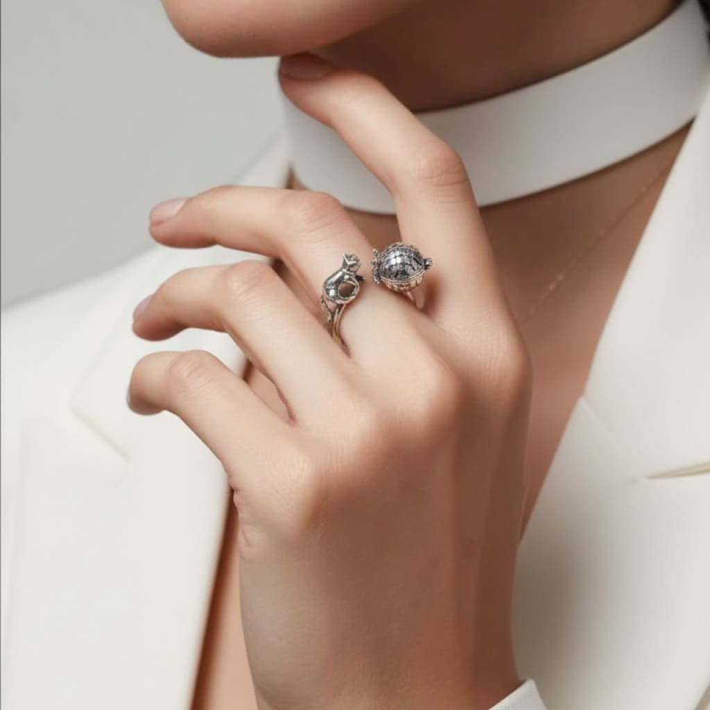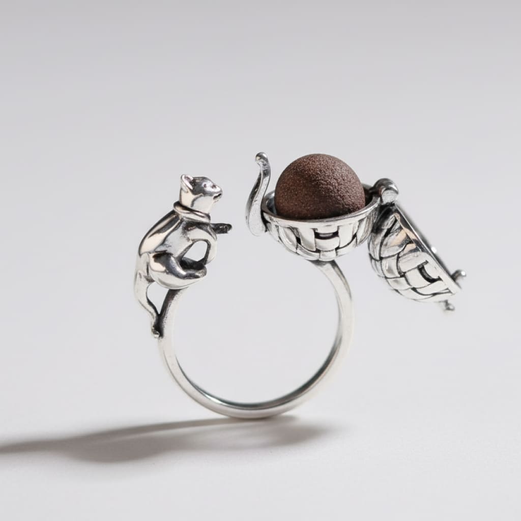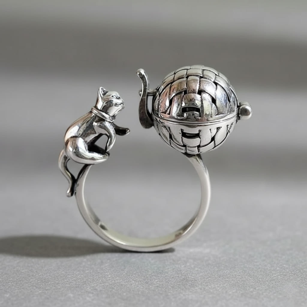 Cat Hug Aroma Ring — silver-tone jewelry alloy, with a scented bead inside (fragrance varies).